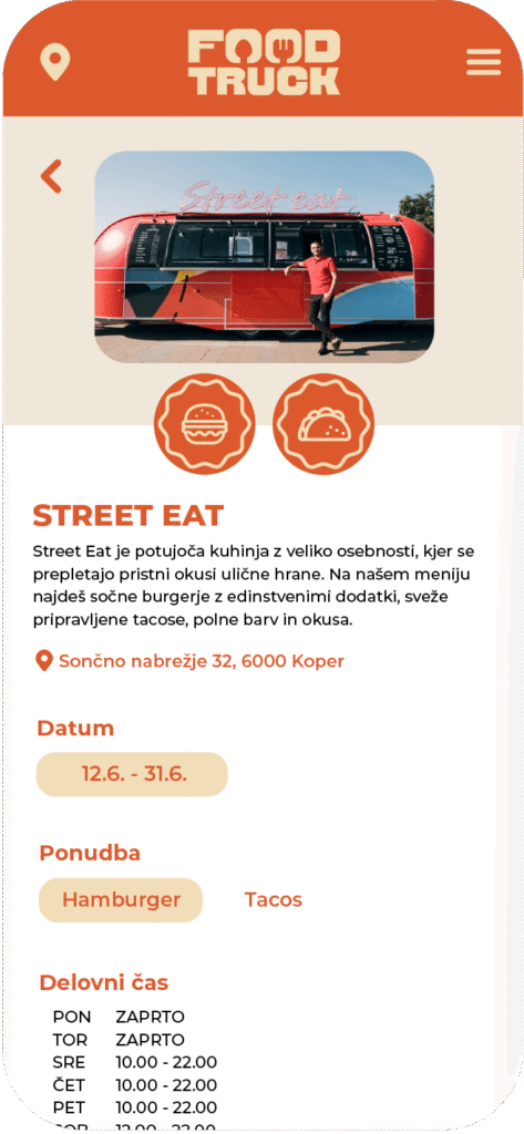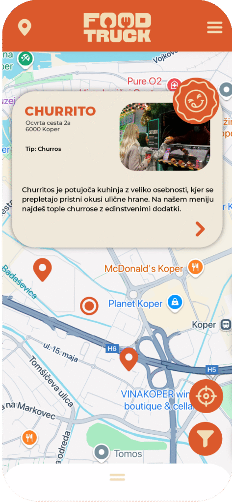 Odpri aplikacijo in poglej, kateri food trucki so trenutno v tvoji bližini.